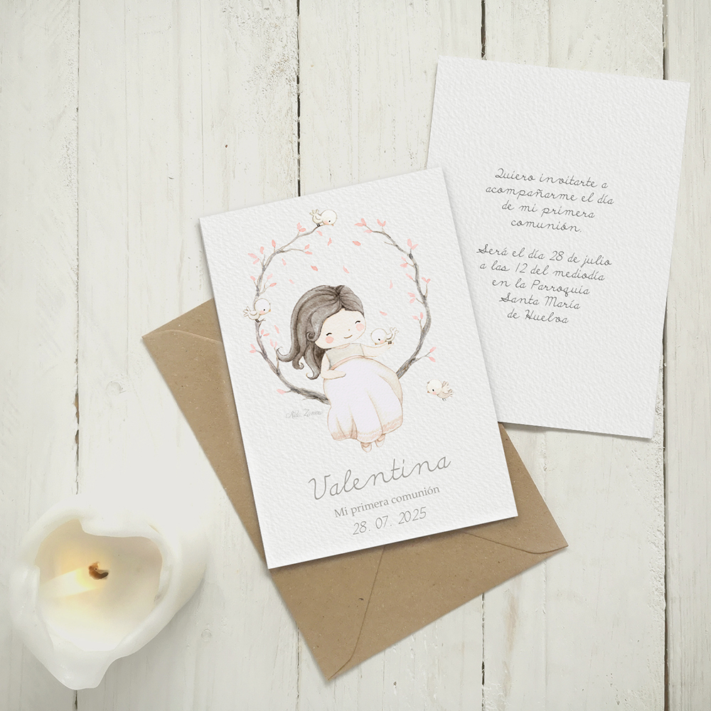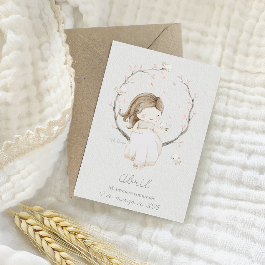 Recordatorios e invitaciones de Comunión para niña – Pajaritos. Diseño realizado en acuarela con colores dulces y suaves para su día especial.
